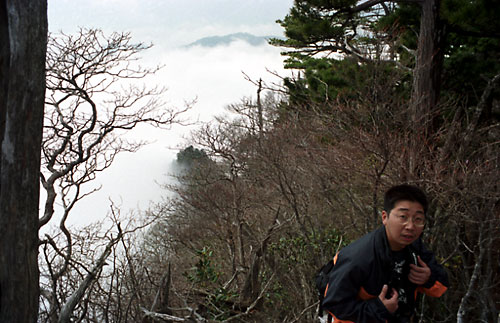 頑張って昇って昇って昇って、下を見ると衝動に駆られるじゃないですか。雲海は白くて柔らかくて、たぶん衝撃をやわらげてくれそうな、そんな衝動が沸き起こるじゃないですか。 そして両手を大きく広げるわけですよ、ね。